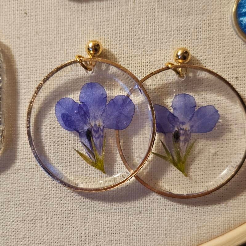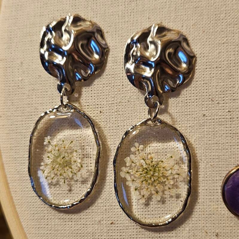 Petits fleurs naturelles résinées encadré d'une fenêtre ouverte dorée, bijoux en acier inoxydable.