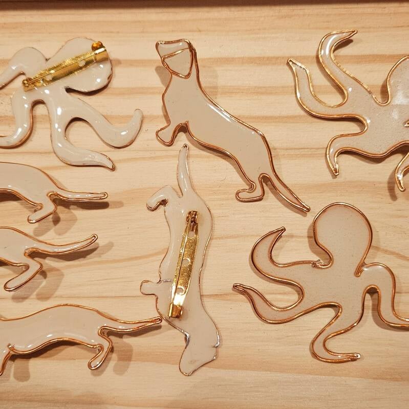 Broches teckel et poulpe, en argile polymère, fils d'aluminium et résine.