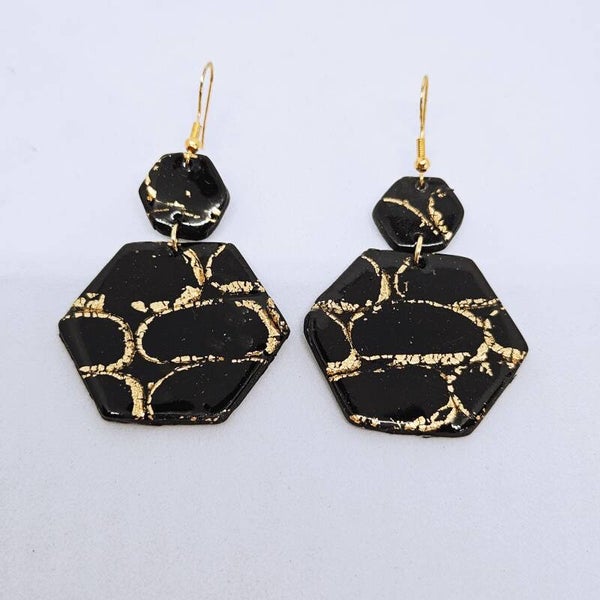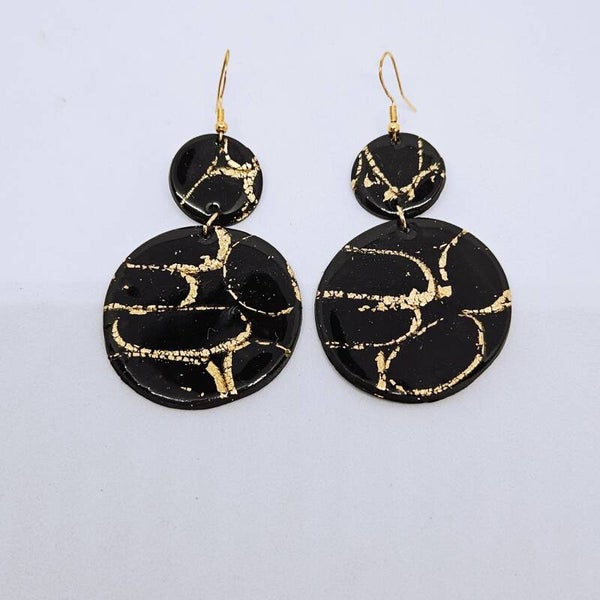 Boucles d'oreilles effet marbré noir et feuille d'or, en argile polymère et résine pour son côté brillant.