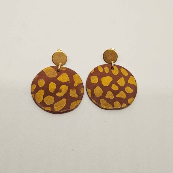 Boucles d'oreilles en argile polymère, sérigraphiées avec des motifs "savane" et vernies.