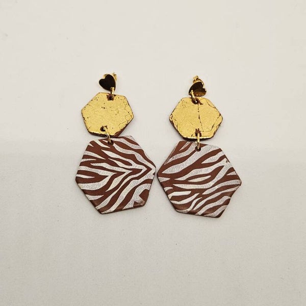 les boucles avec le rond doré et l'octogone zèbre sur fond blanc mesurent 3,5 cm